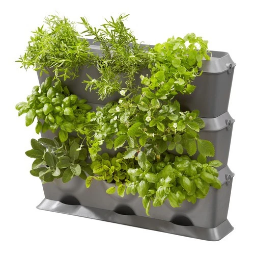 De Gardena NatureUp! Basis Set verticaal is een flexibel systeem om snel en eenvoudig kale muren tot leven te brengen met bloemen, kruiden en groenten. Het verbindingssysteem met weerbestendige kunststof plantenbakken is modulair, uitbreidbaar en zonder gereedschap in elkaar te zetten. De bakken kunnen op de grond staan of stevig aan de muur worden opgehangen. Een afvoersysteem in elke plantenbak voorkomt overbewatering. Overtollig water wordt opgevangen in een lekbak van de vloerplaat. Zo blijven muur en grond schoon. De set bestaat uit 3 verticale plantenbakken, 3 deksels, 1 vloerplaat en 12 verbindingsclips.